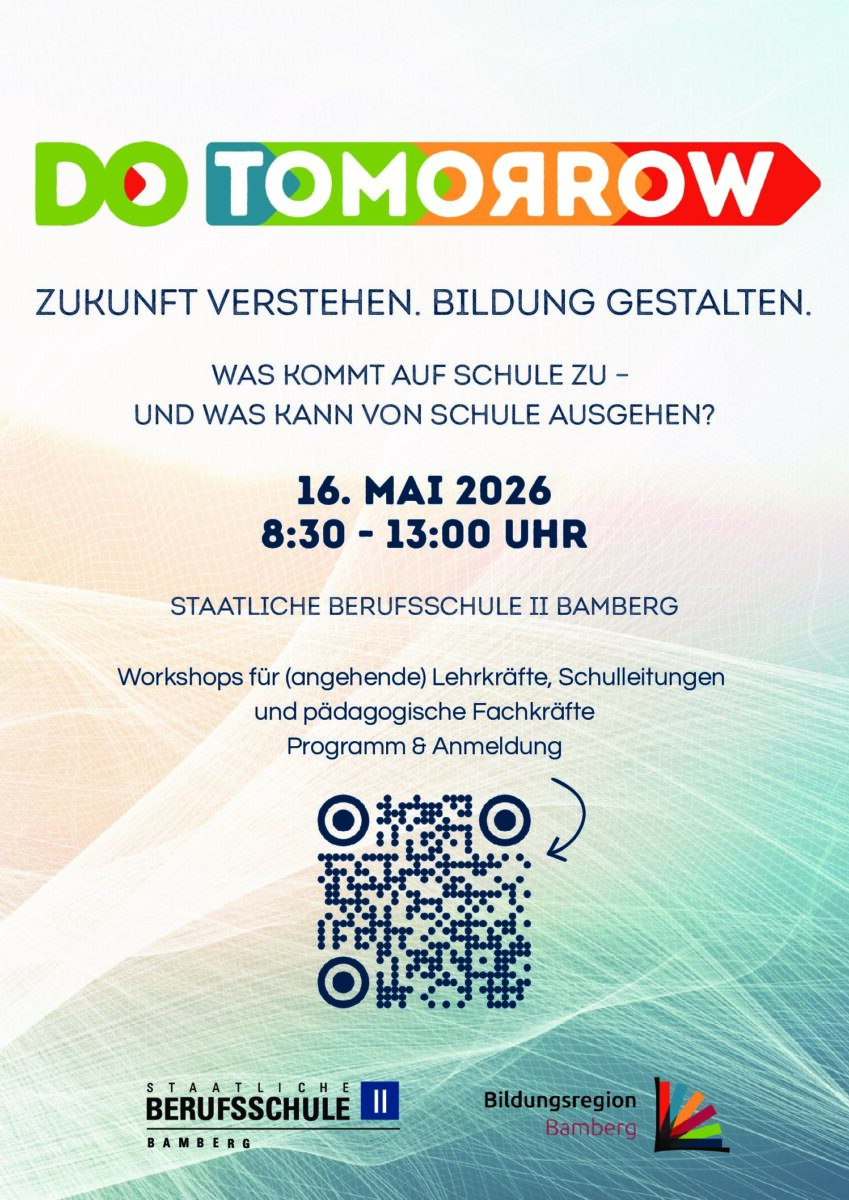 Am Samstag, den 16. Mai 2026, laden die Staatliche Berufsschule II Bamberg und das Bildungsbüro des Landkreises Bamberg Lehrkräfte, Lehramtsstudierende und Schulleitungen aller Schularten sowie pädagogische Fachkräfte zu einem inspirierenden Bildungstag rund um Zukünftebildung (Futures Literacy) ein.